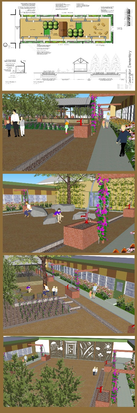 The design proposes the creation of a multi-use outdoor class room that will incorporate runoff water collection, organic gardening practices, and a created wetland. A total of five outdoor learning spaces will be created and involvement of the student body will be utilized in the metal wall panels in the art classroom.